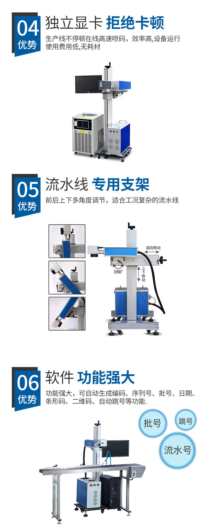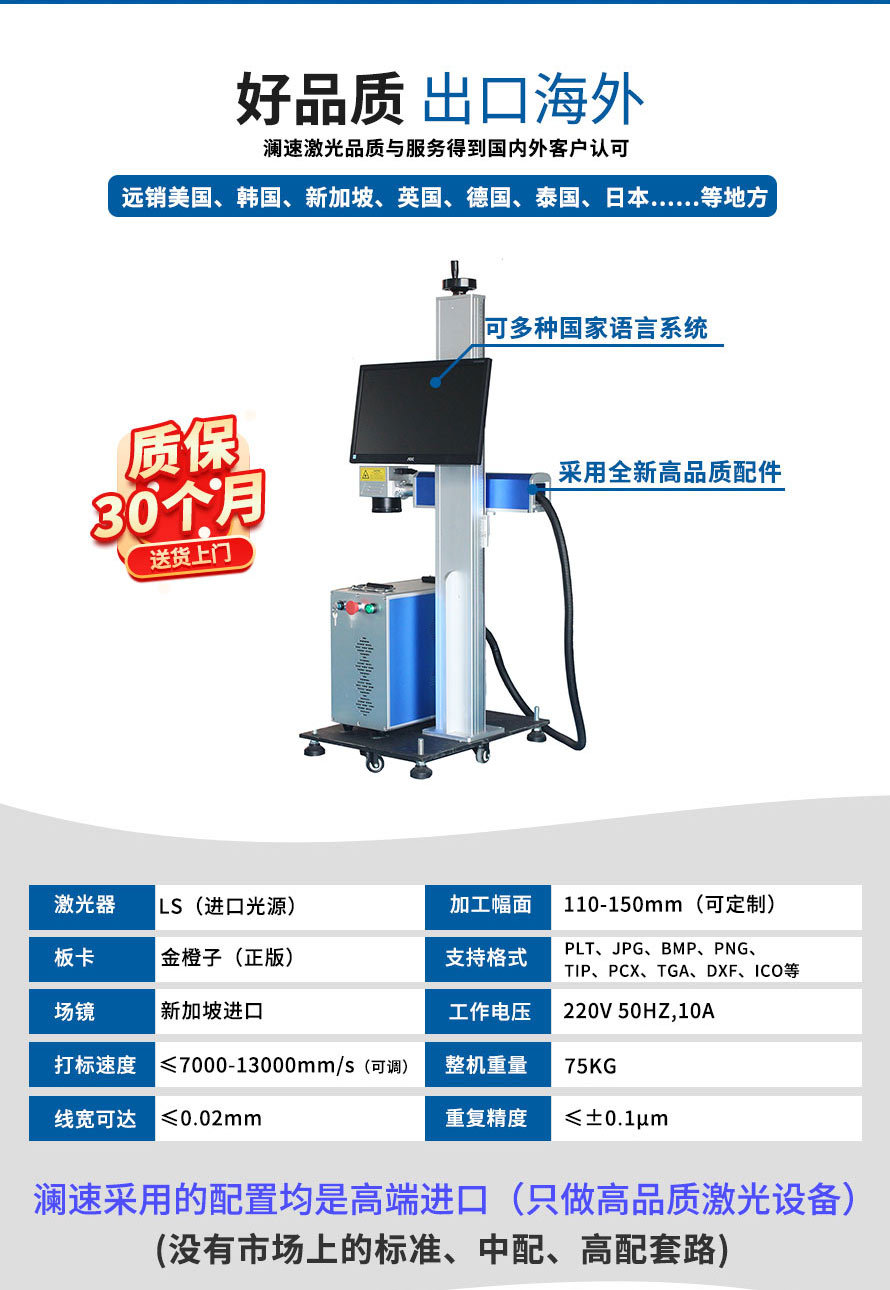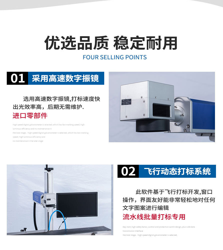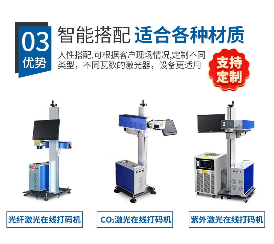 2、在線式飛行激光打標(biāo)機(jī)直接與流水線配合,減少人工成本,操作人員可以避開惡劣生產(chǎn)環(huán)境。 3、滿足標(biāo)記打標(biāo)的多樣化需求,自動(dòng)化生產(chǎn)、流水線生產(chǎn)、以及非常規(guī)界面材質(zhì)的需求。 4、功能強(qiáng)大,具有較強(qiáng)的文字編排和圖形處理功能,可自動(dòng)生成批號和流水號、跳號。 5、省電節(jié)能,整機(jī)功率僅600W,一小時(shí)不到1度電。" />